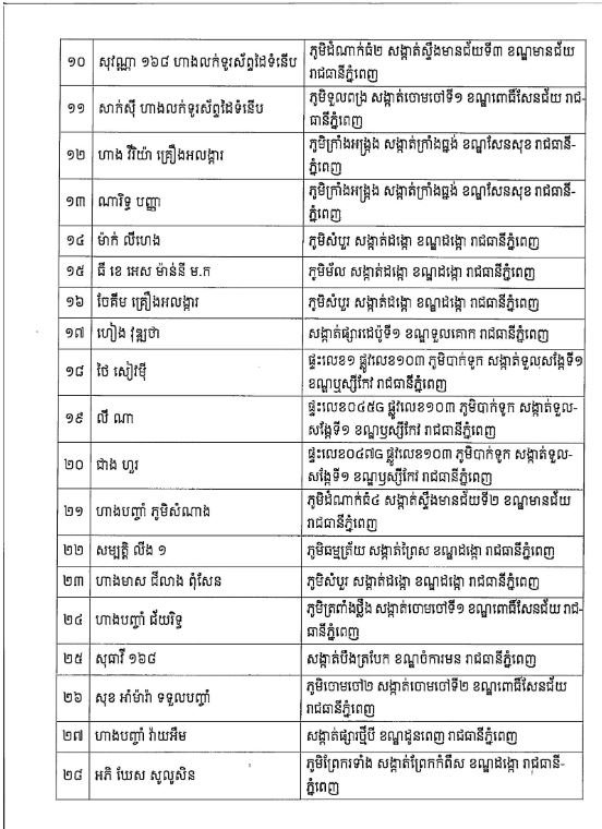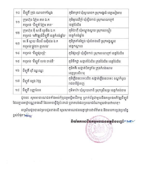 រាជធានីភ្នំពេញ៖អ និយ័តករអាជីវកម្មអចលនវត្ថុ និងបញ្ចាំ បានចេញសេចក្តីជូនដំណឹង ដោយប្រកាសឈ្មោះអាជីវកម្មអភិវឌ្ឍលំនៅឋាន និងអគារសហកម្មសិទ្ធិ, ការប្រកបអាជីវកម្មអភិវឌ្ឍដីឡូត៍, ការប្រកបអាជីវកម្មភ្នាក់ងារអចលនវត្ថុ និងការប្រកបអាជីវកម្មបញ្ចាំ និងប្រាតិភោគដោយអនុប្បទាន ដោយគ្មានអាជ្ញាបណ្ណពីនិយ័តករអាជីវកម្មអចលនវត្ថុ និងបញ្ចាំ។