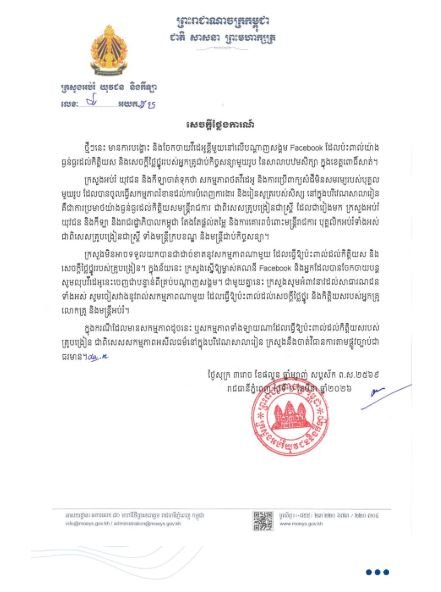 រាជធានីភ្នំពេញ៖ ក្រសួងអប់រំ យុវជន និងកីឡា នៅថ្ងៃទី៦ ខែមីនា ឆ្នាំ២០២៦នេះ បានចេញចេញសេចក្ដីថ្លែងការណ៍ជុំវិញករណី ថ្មីៗនេះមានការបង្ហោះ និងចែកចាយវីដេអូខ្លី មួយនៅលើបណ្តាញសង្គម Facebook ដែលប៉ះពាល់យ៉ាងធ្ងន់ធ្ងរ ដល់កិត្តិយស និងសេចក្តីថ្លៃថ្នូររបស់អ្នកគ្រូ ជាប់កិច្ចសន្យាម្នាក់ នៃសាលាបឋមសិក្សា ក្នុងខេត្តពោធិ៍សាត់។