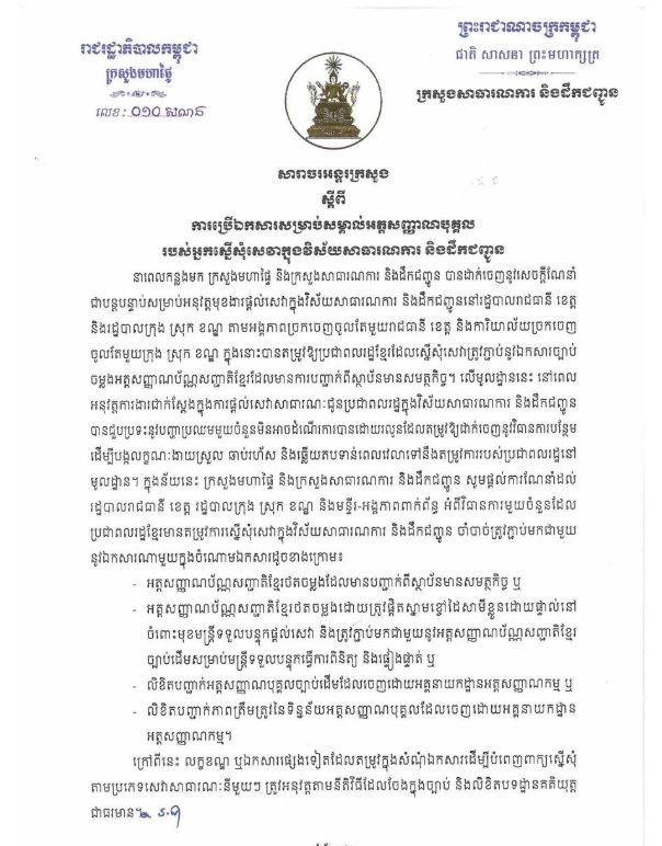 ក្រសួងមហាផ្ទៃ និងក្រសួងសាធារណការ និងដឹកជញ្ជូន បានចេញសារាចររួមគ្នា ស្តីពីការប្រើឯកសារសម្រាប់សម្គាល់អត្តសញ្ញាណបុគ្គល របស់អ្នកស្នើសុំសេវាក្នុងវិស័យសាធារណការ និងដឹកជញ្ជូន។