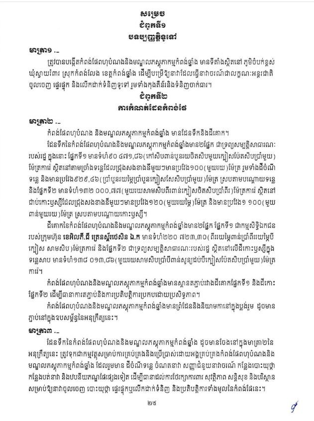 រាជធានីភ្នំពេញ៖សម្តេចបវរធិបតី ហ៊ុន ម៉ាណែត នាយករដ្ឋមន្ត្រីនៃកម្ពុជា បានចេញអនុក្រឹត្យសម្រេចបង្កើតកំពង់ផែពហុបំណង និងមណ្ឌលភស្តុភាកម្មកំពង់ឆ្នាំង នៅស្រុកកំពង់លែង។