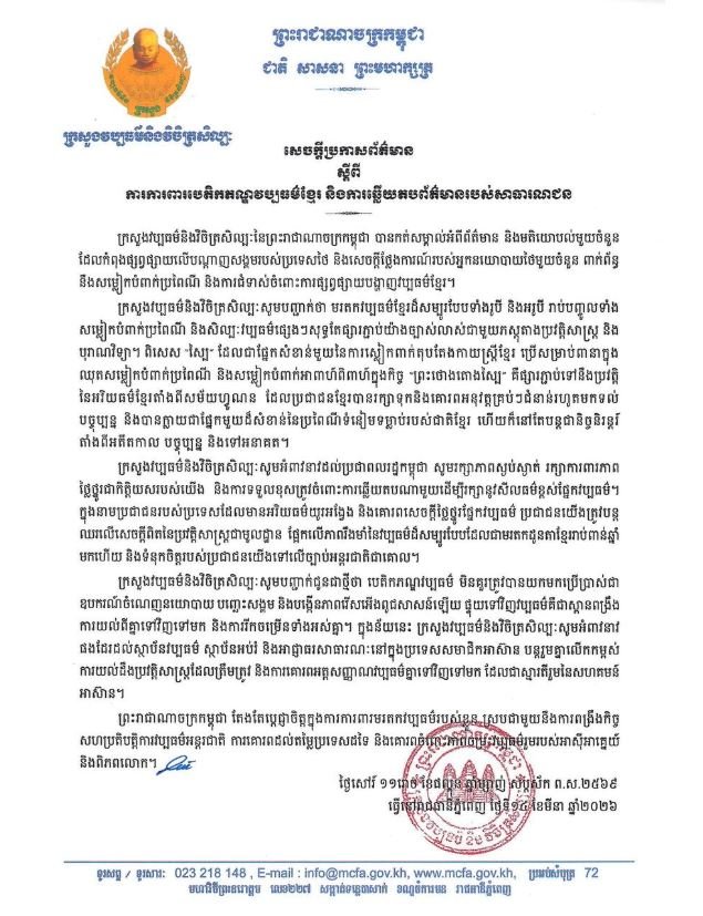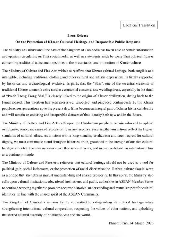សេចក្តីប្រកាសព័ត៌មាននេះ បានធ្វើឡើងបន្ទាប់ពីក្រសួងវប្បធម៌ បានកត់សម្គាល់អំពីព័ត៌មាន និងមតិយោបល់មួយចំនួនដែលកំពុងផ្សព្វផ្សាយលើបណ្តាញសង្គមរបស់ប្រទេសថៃ និងសេចក្តីថ្លែងការណ៍របស់អ្នកនយោបាយថៃមួយចំនួន ពាក់ព័ន្ធនឹងសម្លៀកបំពាក់ប្រពៃណី និងការជំទាស់ចំពោះការផ្សព្វផ្សាយបង្ហាញវប្បធម៌ខ្មែរ៕