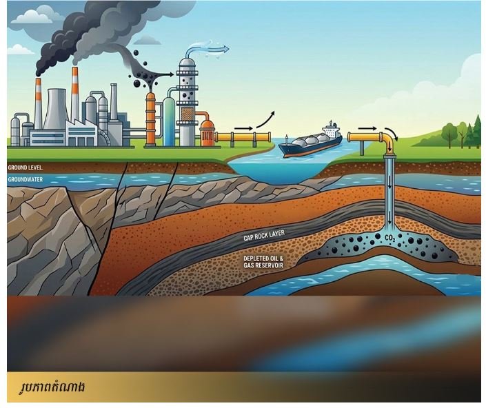 រាជធានីភ្នំពេញ៖ ការចាប់យក និងរក្សាទុកកាបូន (Carbon Caspanture and Storage – CCS) គឺជាបច្ចេកវិទ្យាមួយដែលត្រូវបានបង្កើតឡើង ដើម្បីកាត់បន្ថយបរិមាណឧស្ម័នកាបូនឌីអុកស៊ីត (CO₂) ដែលបញ្ចេញទៅក្នុងបរិយាកាស។ វាដំណើរការដោយការចាប់យកឧស្ម័នកាបូនឌីអុកស៊ីតពីដំណើរការឧស្សាហកម្ម និងរោងចក្រផលិតអគ្គិសនី បន្ទាប់មកដឹកជញ្ជូនវ