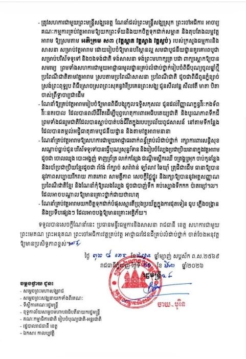 រាជធានីភ្នំពេញ៖ក្រសួងធម្មការនិងសាសនា បានចេញសេចក្តីណែនាំ ស្តីពីការរៀបចំពិធីបុណ្យចូលឆ្នាំថ្មីប្រពៃណីជាតិ ឆ្នាំមមី អដ្ឋស័ក ព.ស២៥៧០ គ.ស២០២៦។
