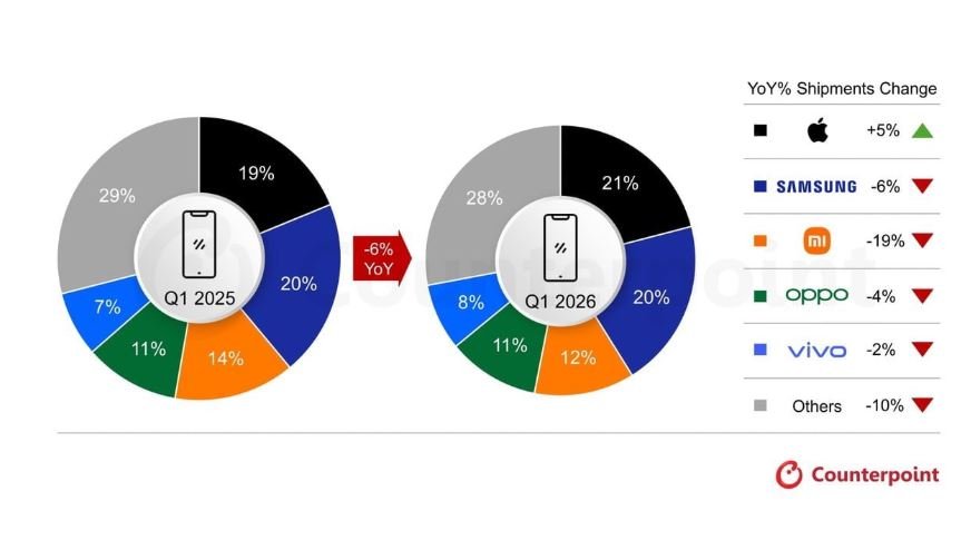 ទោះបីជាស្ថានភាពទីផ្សារទូរស័ព្ទសកលមានការធ្លាក់ចុះក៏ដោយ ក៏ក្រុមហ៊ុន Apple នៅតែអាចបង្កើនការនាំចេញ iPhone របស់ខ្លួនបាន ៥% ក្នុងត្រីមាសទីមួយនៃឆ្នាំ ២០២៦ នេះ។ តាមរបាយការណ៍ពី Counterpoint Research បានឱ្យដឹងថា Apple បានក្លាយជាអ្នកដឹកនាំទីផ្សារលំដាប់ថ្នាក់លេខ១ ដោយកាន់កាប់ចំណែកទីផ្សារ ២១% ដែលលទ្ធផលដ៏ល្អនេះបានមកពីភាពខ្លាំងនៃសង្វាក់ផ្គត់ផ្គង់ និងការហក់ឡើងនៃចំនួនលក់យ៉ាងខ្លាំងរហូតដល់ ២៣% នៅក្នុងប្រទេសចិន។ នេះបើយោងតាមការចេញផ្សាយដោយទីភ្នាក់ងារសារព័ត៌មាន Reuters នៅថ្ងៃទី១១ ខែមេសា ឆ្នាំ២០២៦។