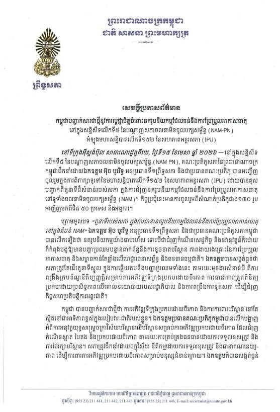 នៅក្នុងសន្និសីទលើកទី៥ នៃបណ្តាញសភាចលនាមិនចូលបក្សសម្ព័ន្ធ (NAM PN), គណៈប្រតិភូសភានៃកម្ពុជា ដឹកនាំដោយលោក អ៊ុច បូររិទ្ធ អនុប្រធានទី១ព្រឹទ្ធសភា និងជាប្រធានគណៈប្រតិភូ នៅថ្ងៃទី១៥ ខែមេសា ឆ្នាំ២០២៦ បានអញ្ជើញចូលរួមក្នុងការពិភាក្សាទូទៅនៃមហាសន្និបាតលើកទី១៥២ នៃសហភាពអន្តរសភា (IPU) ដោយបានគូសបញ្ជាក់ពី តួនាទីដ៏សំខាន់របស់សភា ក្នុងការជំរុញនគរូបនីយកម្មដែលធន់នឹងបម្រែបម្រួលអាកាសធាតុ នៅទូទាំងចលនាមិនចូលបក្សសម្ព័ន្ធ (NAM)។ កិច្ចប្រជុំនេះមានការចូលរួមពីសំណាក់ប្រតិភូជាង១៣០ រូប អញ្ជើញមកពីជិត ៥០ ប្រទេស និងអង្គការ។