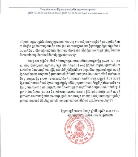 ជាលទ្ធផល សន្និសីទលើកទី៥ នៃបណ្តាញសភាចលនាមិនចូលបក្សសម្ព័ន្ធ (NAM PN) បានសម្រេចបង្កើតទីស្នាក់ការកណ្តាលរបស់ខ្លួន នៅទីក្រុងបាគូ (Baku) ផ្តល់ឋានៈជាអ្នកសង្កេតការណ៍ដល់សភាអារ៉ាប់ និងបានអនុម័តសេចក្តីថ្លែងការណ៍ទីក្រុងអ៊ីស្តង់ប៊ុល។ ជាមួយនឹងធាតុចូលរបស់កម្ពុជា សេចក្តីថ្លែងការណ៍នេះបានបញ្ជាក់ជាថ្មីនូវគោលការណ៍គ្រឹះនៃអធិបតេយ្យភាព និងបូរណភាពទឹកដី របស់ចលនាមិនចូលបក្សសម្ព័ន្ធ (NAM) ខណៈពេលដែលកំពុងងាកទៅរកអាទិភាពយុទ្ធសាស្ត្រទំនើប។ សេចក្តីថ្លែងការណ៍នេះ បានកំណត់ឱ្យមានការផ្លាស់ប្តូរផ្នែកនីតិកម្មឆ្ពោះទៅរកការអភិវឌ្ឍទីក្រុងដែលធន់នឹងការប្រែប្រួលអាកាសធាតុ ដោយតម្រូវឱ្យសមាជិកសភាប្តេជ្ញាធានានូវថវិកាជាតិសម្រាប់គោលដៅអភិវឌ្ឍន៍ប្រកបដោយចីរភាព (SDGs) និងសេវាសាធារណៈចាំបាច់នានា។ អ្វីដែលសំខាន់បំផុតនោះគឺ សេចក្ដីប្រកាសបានការពារយុត្តិធម៌ អាកាសធាតុសម្រាប់តំបន់ភាគខាងត្បូងនៃពិភពលោក ដោយទាមទារឱ្យមានការផ្ទេរបច្ចេកវិទ្យាប្រកបដោយសមធម៌ និងហិរញ្ញប្បទានដែលអាចព្យាករណ៍បាន ដើម្បីកាត់បន្ថយវិសមភាពបរិស្ថាន៕