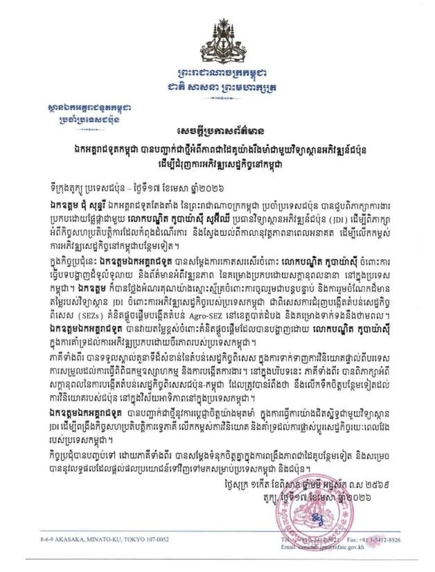 លោក ជុំ សុន្ទរី ឯកអគ្គរាជទូតកម្ពុជាប្រចាំប្រទេសជប៉ុន នៅថ្ងៃទី១៧ ខែមេសា ឆ្នាំ២០២៦ បានជួបពិភាក្សាការងារប្រកបដោយផ្លែផ្កាជាមួយ លោកបណ្ឌិត កូបាយ៉ាស៊ី សូអ៊ីឈី ប្រធានវិទ្យាស្ថានអភិវឌ្ឍន៍ជប៉ុន (JDI) ដើម្បីពិភាក្សាអំពីកិច្ចសហប្រតិបត្តិការ ដែលកំពុងដំណើរការ និងស្វែងយល់ពីកាលានុវត្តភាពនាពេលអនាគត ដើម្បីលើកកម្ពស់ការអភិវឌ្ឍសេដ្ឋកិច្ចនៅកម្ពុជាបន្ថែមទៀត។