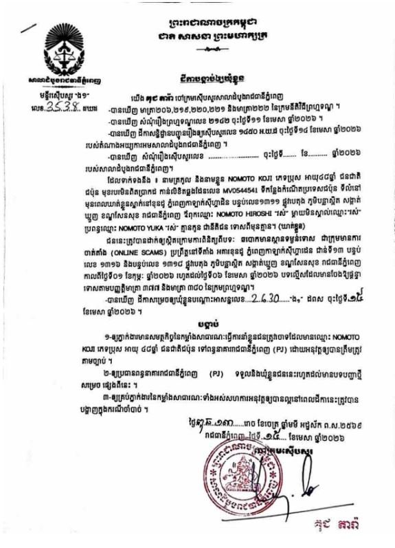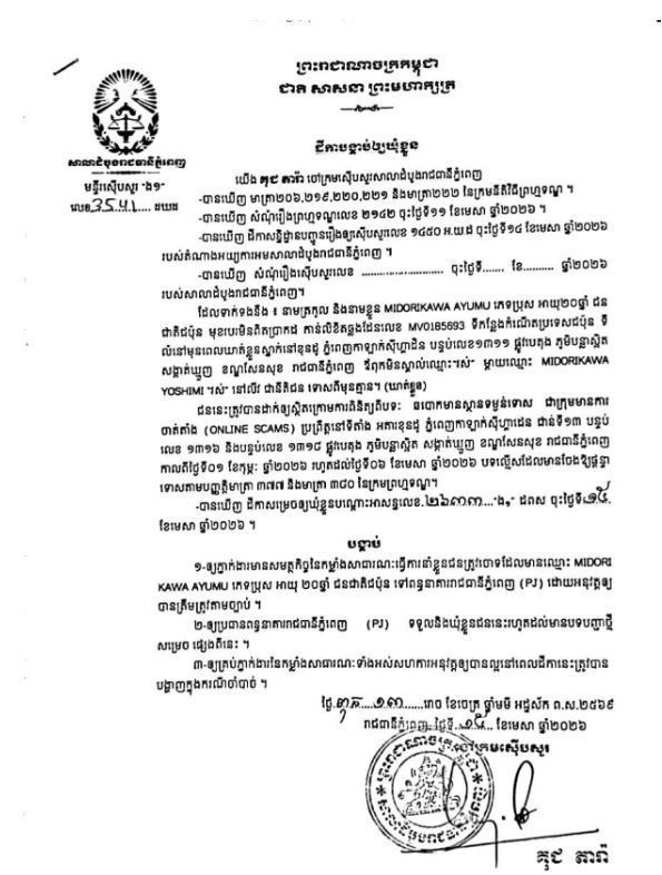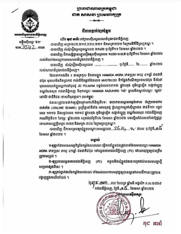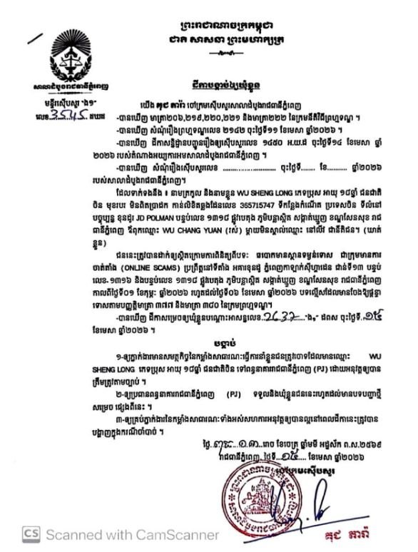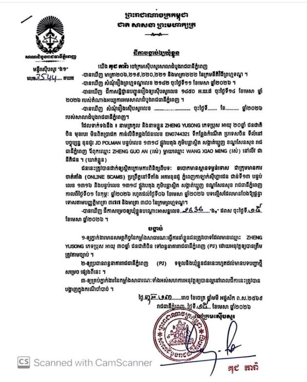 រាជធានីភ្នំពេញ៖ចៅក្រមស៊ើបសួរ នៃសាលាដំបូងរាជធានីភ្នំពេញ នៅថ្ងៃទី១៥ ខែមេសា ឆ្នាំ២០២៦ បានសម្រេចចោទប្រកាន់ជនត្រូវចោទជា ចំនួន៨នាក់ ពីបទឆបោកមានស្ថានទម្ងន់ទោសជាក្រុមមានការចាត់តាំង Online Scam ទៅឃុំខ្លួននៅពន្ធនាគាររាជធានីភ្នំពេញ (PJ)។
