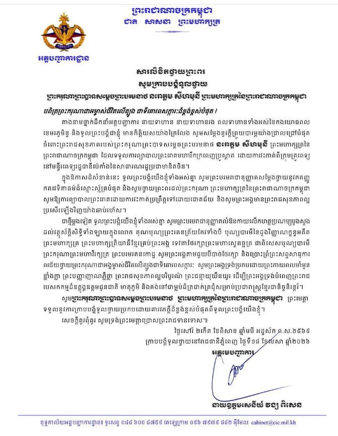 ទូលព្រះបង្គំជាខ្ញុំ សូមសម្តែងនូវក្តីបារម្ភ ក្រោយពីទទួលព័ត៌មានថា ព្រះរោគមហារីកក្រពេញប្រូស្តាត (prostate cancer) របស់ព្រះករុណា ជាអម្ចាស់ជីវិតលើត្បូង ជាទីគោរពសក្ការៈដ៏ខ្ពង់ខ្ពស់បំផុត តម្រូវឱ្យព្រះអង្គទទួលការព្យាបាលដោយការវះកាត់តាមវេជ្ជបញ្ជា នៅមន្ទីរពេទ្យនារដ្ឋធានីប៉េកាំង នៃសាធារណរដ្ឋប្រជាមានិតចិន និងបន្តគង់ប្រថាប់នៅទីនោះមួយរយៈពេល ដើម្បីតាមដានត្រួតពិនិត្យ និងព្យាបាលព្រះរោគ ចាប់ពីថ្ងៃទី១៨ ខែមេសា ឆ្នាំ២០២៦នេះ។
