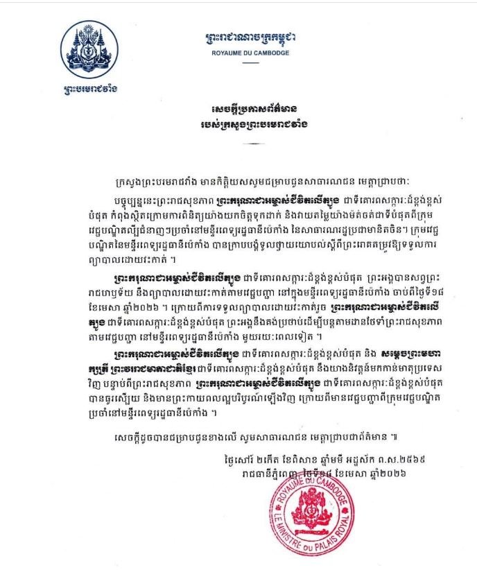 ទូលព្រះបង្គំជាខ្ញុំ សូមសម្តែងនូវក្តីបារម្ភ ក្រោយពីទទួលព័ត៌មានថា ព្រះរោគមហារីកក្រពេញប្រូស្តាត (prostate cancer) របស់ព្រះករុណា ជាអម្ចាស់ជីវិតលើត្បូង ជាទីគោរពសក្ការៈដ៏ខ្ពង់ខ្ពស់បំផុត តម្រូវឱ្យព្រះអង្គទទួលការព្យាបាលដោយការវះកាត់តាមវេជ្ជបញ្ជា នៅមន្ទីរពេទ្យនារដ្ឋធានីប៉េកាំង នៃសាធារណរដ្ឋប្រជាមានិតចិន និងបន្តគង់ប្រថាប់នៅទីនោះមួយរយៈពេល ដើម្បីតាមដានត្រួតពិនិត្យ និងព្យាបាលព្រះរោគ ចាប់ពីថ្ងៃទី១៨ ខែមេសា ឆ្នាំ២០២៦នេះ។