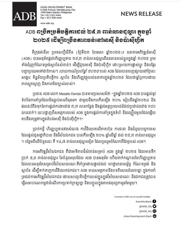 ធនាគារអភិវឌ្ឍន៍អាស៊ី (ADB) បានអនុម័តផ្តល់ហិរញ្ញប្បទាន ២៩.៣ ពាន់លានដុល្លារពីធនធានរបស់ខ្លួនក្នុងឆ្នាំ ២០២៥ ព្រមទាំងជំរុញកំណែទម្រង់ស្ថាប័នសំខាន់ៗ ដើម្បីជួយអាស៊ី និងប៉ាស៊ីហ្វិក ដោះស្រាយការផ្លាស់ប្តូរ និងបង្វែរបញ្ហាប្រឈមទៅជាឱកាស។ នេះបើតាមសេចក្តីប្រកាសព័ត៌មានរបស់ ADB ចេញផ្សាយនៅថ្ងៃទី២៣ ខែមេសានេះ។
