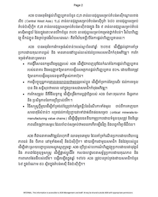 ប្រធាន ADB លោក Masato Kanda បានមានប្រសាសន៍ថា «ក្នុងឆ្នាំ២០២៥ ADB បានផ្តល់នូវ ទំហំនៃការគាំទ្រដែលមិនធ្លាប់មានពីមុនមក ជាមួយនឹងការកើនឡើង ២០% ធៀបនឹងឆ្នាំ២០២៤ និងផលជះរំពឹងទុកនៃការផ្តល់ការងារជាង ៣.៣ លានកន្លែង និងផ្តល់អត្ថប្រយោជន៍ដល់ប្រជាជនជាង ១៨០ លាននាក់។ នេះបង្ហាញពីសមត្ថភាពរបស់ ADB ក្នុងការផ្តល់ការគាំទ្រក្នុងទំហំ និងល្បឿនមួយដែលឆ្លើយតបនឹងតម្រូវការក្នុងតំបន់អាស៊ី និងប៉ាស៊ីហ្វិក»។