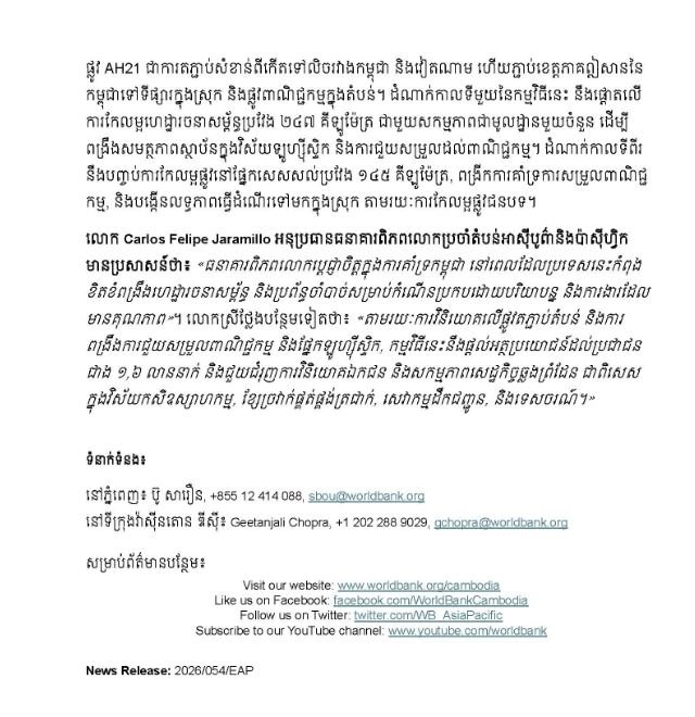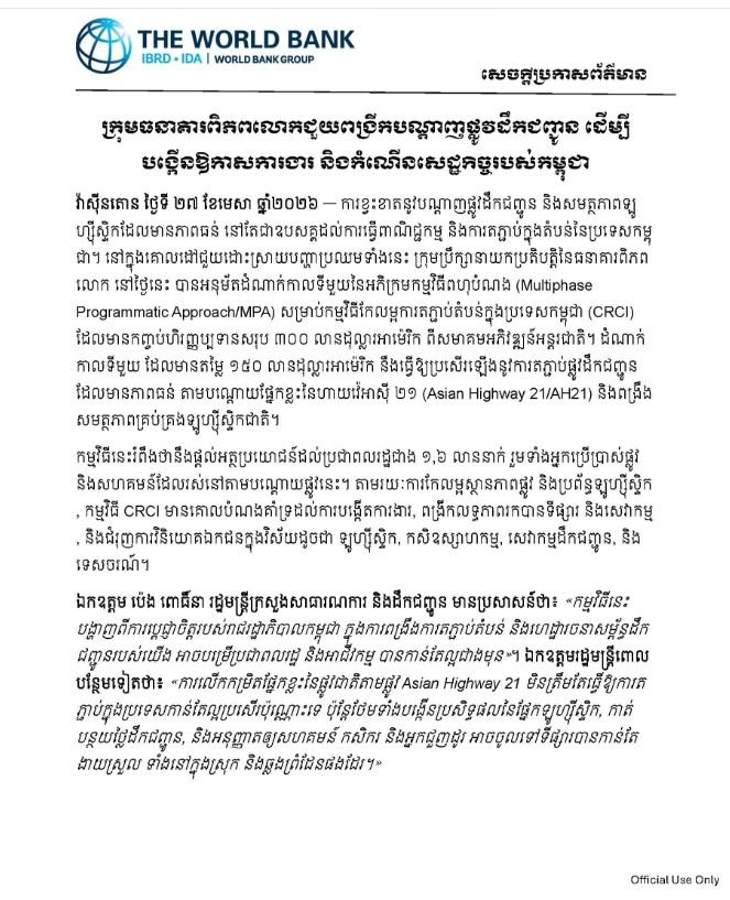 | ធនាគារពិភពលោក ផ្ដល់ហិរញ្ញប្បទានសរុប៣០០លានដុល្លារ ដេីម្បីជួយពង្រីកបណ្តាញផ្លូវដឹកជញ្ជូននៅកម្ពុជា |