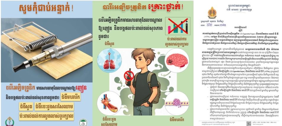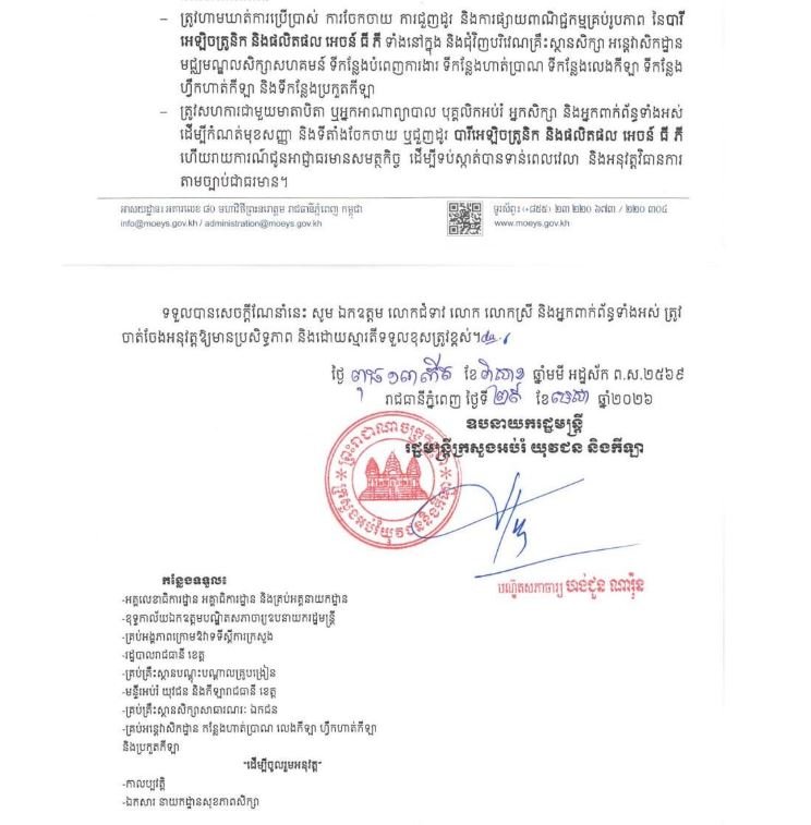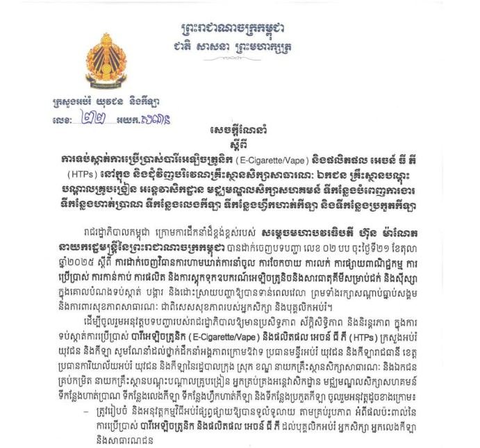 រាជធានីភ្នំពេញ៖ក្រសួងអប់រំ យុវជន និងកីឡា បានចេញសេចក្តីណែនាំថ្មី ស្តីពីការទប់ស្កាត់ការប្រើប្រាស់បារីអេឡិចត្រូនិច (E-Cigarette/Vape) និងផលិតផល អេចជ៍ ធី ភី (HTPs) នៅក្នុង និងជុំវិញបរិវេណគ្រឹះស្ថានសិក្សាសាធារណៈ ឯកជន គ្រឹះស្ថានបណ្តុះបណ្តាលគ្រូបង្រៀន អន្តេវាសិកដ្ឋាន មជ្ឈមណ្ឌលសិក្សាសហគមន៍ ទីកន្លែងបំពេញការងារ ទីកន្លែងហាត់ប្រាណ ទីកន្លែងលេងកីឡា ទីកន្លែងហ្វឹកហាត់កីឡា និងទីកន្លែងប្រកួតកីឡា។
