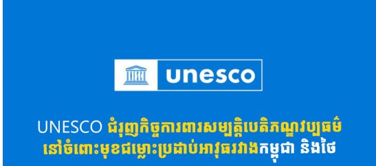 | UNESCO ជំរុញកិច្ចការពារសម្បត្តិបេតិភណ្ឌវប្បធម៌ នៅចំពោះមុខជម្លោះប្រដាប់អាវុធរវាងកម្ពុជា និងថៃ |