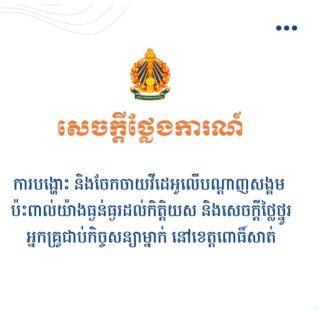រាជធានីភ្នំពេញ៖ ក្រសួងអប់រំ យុវជន និងកីឡា នៅថ្ងៃទី៦ ខែមីនា ឆ្នាំ២០២៦នេះ បានចេញចេញសេចក្ដីថ្លែងការណ៍ជុំវិញករណី ថ្មីៗនេះមានការបង្ហោះ និងចែកចាយវីដេអូខ្លី មួយនៅលើបណ្តាញសង្គម Facebook ដែលប៉ះពាល់យ៉ាងធ្ងន់ធ្ងរ ដល់កិត្តិយស និងសេចក្តីថ្លៃថ្នូររបស់អ្នកគ្រូ ជាប់កិច្ចសន្យាម្នាក់ នៃសាលាបឋមសិក្សា ក្នុងខ