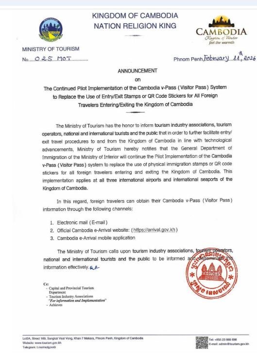 រាជធានីភ្នំពេញ៖ ក្រសួងទេសចរណ៍ នៅថ្ងៃទី១១ ខែកុម្ភៈ ឆ្នាំ២០២៦នេះ បានចេញសេចក្តីជូនដំណឹង ស្តីពីការបន្តប្រើប្រាស់សាកល្បងនូវប្រព័ន្ធ Cambodia v-Pass (Visitor Pass) ដើម្បីជំនួសការប្រើប្រាស់ ត្រាជំនាញ ឬស្ទីកឃ័រ QR កូដ សម្រាប់អ្នកដំណើរបរទេសទាំងអស់ដែលចូល-ចេញកម្ពុជា ដែលអនុវត្តនៅអាកាសយានដ្ឋានអន្តរជាតិទាំង៣ និងកំពង់ផែ អន្តរជាតិ ដោយក្នុងនោះ អ្នកដំណើរបរទេសអាចទទួលបានព័ត៌មាន Cambodia v-Pass (Visitor Pass) របស់ខ្លួនតាមរយៈមធ្យោបាយ ដូចខាងក្រោម៖