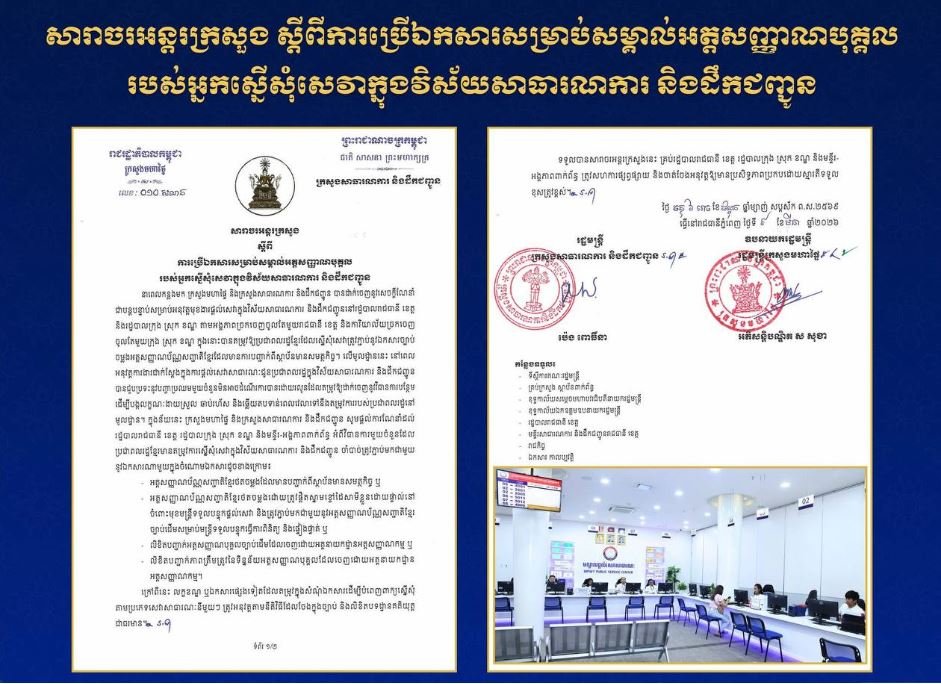 ក្រសួងមហាផ្ទៃ និងក្រសួងសាធារណការ និងដឹកជញ្ជូន បានចេញសារាចររួមគ្នា ស្តីពីការប្រើឯកសារសម្រាប់សម្គាល់អត្តសញ្ញាណបុគ្គល របស់អ្នកស្នើសុំសេវាក្នុងវិស័យសាធារណការ និងដឹកជញ្ជូន។