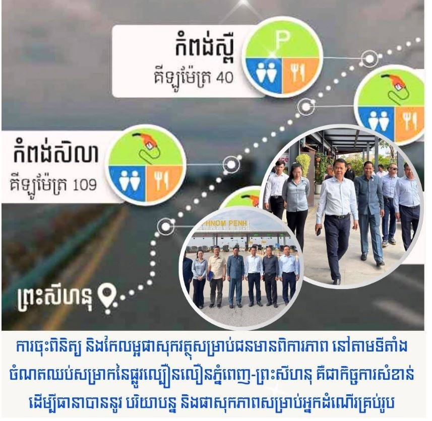 តាមសំណើពីក្រសួងសង្គមកិច្ច អតីតយុទ្ធជន និងយុវនីតិសម្បទា ក្រុមការងារក្រសួងសាធារណការ និងដឹកជញ្ជូន ដឹកនាំដោយលោក ស៊ឹង សុគង់ អនុរដ្ឋលេខាធិការ និងក្រុមការងារក្រសួងសង្គមកិច្ច អតីតយុទ្ធជន និងយុវនីតិសម្បទា ដឹកនាំដោយលោក អ៊ុង សម្បត្តិ អគ្គលេខាធិការ ក្រុមប្រឹក្សាសកម្មភាពជនពិការ នាថ្ងៃទី១១ ខែមីនា ឆ្នាំ២០២៦ បានរួមគ្នាចុះពិនិត្យការរៀបចំ និងកែលម្អហេដ្ឋារចនាសម្ព័ន្ធផាសុកវត្ថុ សម្រាប់ជនមានពិការភាព និងមនុស្សចាស់នៅតាមទីតាំង ឈប់សម្រាកទាំង ៨កន្លែង នៃផ្លូវល្បឿនលឿនភ្នំពេញ-ក្រុងព្រះសីហនុ។ កម្មវិធីនេះក៏មានការចូលរួមពីថ្នាក់ដឹកនាំ និងមន្រ្តីបច្ចេកទេសរបស់ក្រុមហ៊ុនផ្លូវល្បឿនលឿនភ្នំពេញ-ក្រុងព្រះសីហនុ ផងដែរ ។