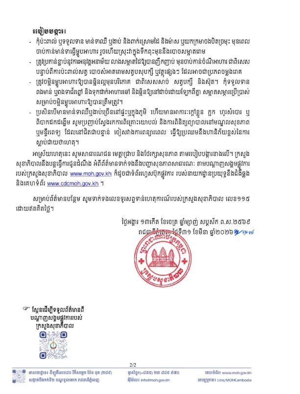 ក្រសួងសុខាភិបាល នៅថ្ងៃទី៣១ ខែមីនា ឆ្នាំ២០២៦នេះ បានចេញសេចក្តីប្រកាសព័ត៌មានបញ្ជាក់ ពីការរកឃើញករណីជំងឺផ្តាសាយបក្សី លើកុមារាអាយុ៣ឆ្នាំម្នាក់ នៅស្រុកបន្ទាយអំពិល ខេត្តឧត្តរមានជ័យ។