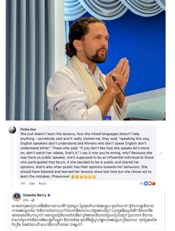 «ហួចកូនហ្នឹងស្តាយអី? និយាយអីចឹងឲ្យជនជាតិណាស្តាប់? គេថាឡូយ ឬពេលនិយាយបែបនឹង? ឬក៏អត់ចេះនិយាយខ្មែរពេញលេញ? ឬជោរពេក និយាយភាសារខ្មែរទៅវាមិនសមនឹងសម្ថភាពខ្លួន? និយាយមែន មួយជីវិតខ្ញុំស្គាល់អ្នកចេះអងគ្លេសច្រើនណាស់ កូនខ្មែរអាគាំងក៏ច្រើន តែអត់ដែលលឺនរណានិយាយបែបនេះបានឆ្ងល់»។ នេះបើតាមការបង្ហោះសាររបស់ហ្វេសប៊ុក Sweetie Berry។