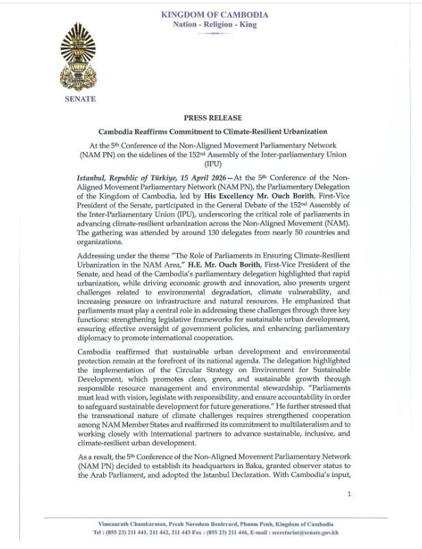 នៅក្នុងសន្និសីទលើកទី៥ នៃបណ្តាញសភាចលនាមិនចូលបក្សសម្ព័ន្ធ (NAM PN), គណៈប្រតិភូសភានៃកម្ពុជា ដឹកនាំដោយលោក អ៊ុច បូររិទ្ធ អនុប្រធានទី១ព្រឹទ្ធសភា និងជាប្រធានគណៈប្រតិភូ នៅថ្ងៃទី១៥ ខែមេសា ឆ្នាំ២០២៦ បានអញ្ជើញចូលរួមក្នុងការពិភាក្សាទូទៅនៃមហាសន្និបាតលើកទី១៥២ នៃសហភាពអន្តរសភា (IPU) ដោយបានគូសបញ្ជាក់ពី តួនាទីដ៏សំខាន់របស់សភា ក្នុងការជំរុញនគរូបនីយកម្មដែលធន់នឹងបម្រែបម្រួលអាកាសធាតុ នៅទូទាំងចលនាមិនចូលបក្សសម្ព័ន្ធ (NAM)។ កិច្ចប្រជុំនេះមានការចូលរួមពីសំណាក់ប្រតិភូជាង១៣០ រូប អញ្ជើញមកពីជិត ៥០ ប្រទេស និងអង្គការ។