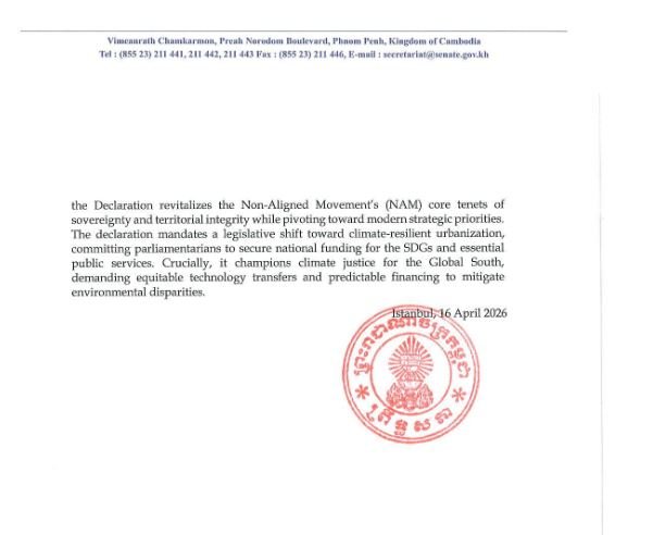 ជាលទ្ធផល សន្និសីទលើកទី៥ នៃបណ្តាញសភាចលនាមិនចូលបក្សសម្ព័ន្ធ (NAM PN) បានសម្រេចបង្កើតទីស្នាក់ការកណ្តាលរបស់ខ្លួន នៅទីក្រុងបាគូ (Baku) ផ្តល់ឋានៈជាអ្នកសង្កេតការណ៍ដល់សភាអារ៉ាប់ និងបានអនុម័តសេចក្តីថ្លែងការណ៍ទីក្រុងអ៊ីស្តង់ប៊ុល។ ជាមួយនឹងធាតុចូលរបស់កម្ពុជា សេចក្តីថ្លែងការណ៍នេះបានបញ្ជាក់ជាថ្មីនូវគោលការណ៍គ្រឹះនៃអធិបតេយ្យភាព និងបូរណភាពទឹកដី របស់ចលនាមិនចូលបក្សសម្ព័ន្ធ (NAM) ខណៈពេលដែលកំពុងងាកទៅរកអាទិភាពយុទ្ធសាស្ត្រទំនើប។ សេចក្តីថ្លែងការណ៍នេះ បានកំណត់ឱ្យមានការផ្លាស់ប្តូរផ្នែកនីតិកម្មឆ្ពោះទៅរកការអភិវឌ្ឍទីក្រុងដែលធន់នឹងការប្រែប្រួលអាកាសធាតុ ដោយតម្រូវឱ្យសមាជិកសភាប្តេជ្ញាធានានូវថវិកាជាតិសម្រាប់គោលដៅអភិវឌ្ឍន៍ប្រកបដោយចីរភាព (SDGs) និងសេវាសាធារណៈចាំបាច់នានា។ អ្វីដែលសំខាន់បំផុតនោះគឺ សេចក្ដីប្រកាសបានការពារយុត្តិធម៌ អាកាសធាតុសម្រាប់តំបន់ភាគខាងត្បូងនៃពិភពលោក ដោយទាមទារឱ្យមានការផ្ទេរបច្ចេកវិទ្យាប្រកបដោយសមធម៌ និងហិរញ្ញប្បទានដែលអាចព្យាករណ៍បាន ដើម្បីកាត់បន្ថយវិសមភាពបរិស្ថាន៕