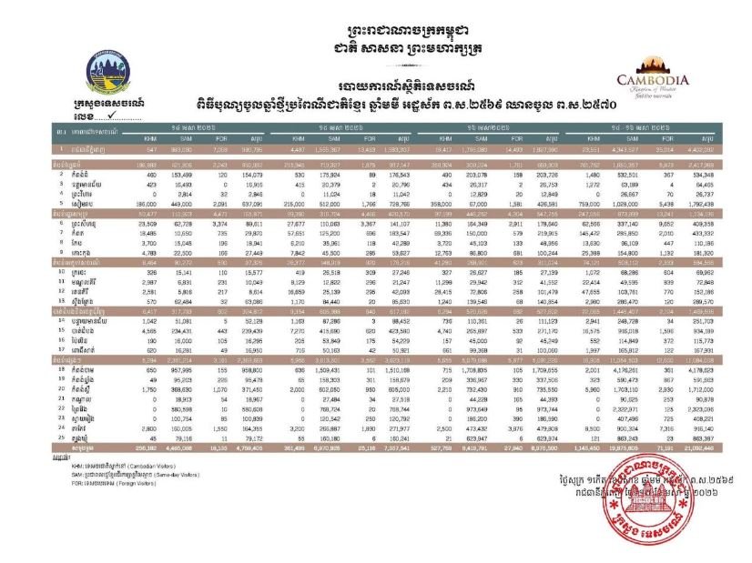 | ក្រសួងទេសចរណ៍៖ ភ្ញៀវទេសចរជាតិ និងទេសចរបរទេសជាង ២១លាននាក់ បានដើរលេងកម្សាន្តនៅតាមរាជធានី-ខេត្តទូទាំងប្រទេស ក្នុងឱកាសបុណ្យចូលឆ្នាំថ្មី រយៈពេល៣ថ្ងៃ |