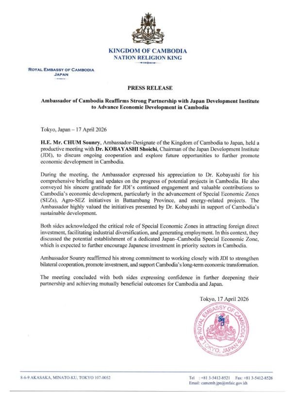 លោក ជុំ សុន្ទរី ឯកអគ្គរាជទូតកម្ពុជាប្រចាំប្រទេសជប៉ុន នៅថ្ងៃទី១៧ ខែមេសា ឆ្នាំ២០២៦ បានជួបពិភាក្សាការងារប្រកបដោយផ្លែផ្កាជាមួយ លោកបណ្ឌិត កូបាយ៉ាស៊ី សូអ៊ីឈី ប្រធានវិទ្យាស្ថានអភិវឌ្ឍន៍ជប៉ុន (JDI) ដើម្បីពិភាក្សាអំពីកិច្ចសហប្រតិបត្តិការ ដែលកំពុងដំណើរការ និងស្វែងយល់ពីកាលានុវត្តភាពនាពេលអនាគត ដើម្បីលើកកម្ពស់ការអភិវឌ្ឍសេដ្ឋកិច្ចនៅកម្ពុជាបន្ថែមទៀត។